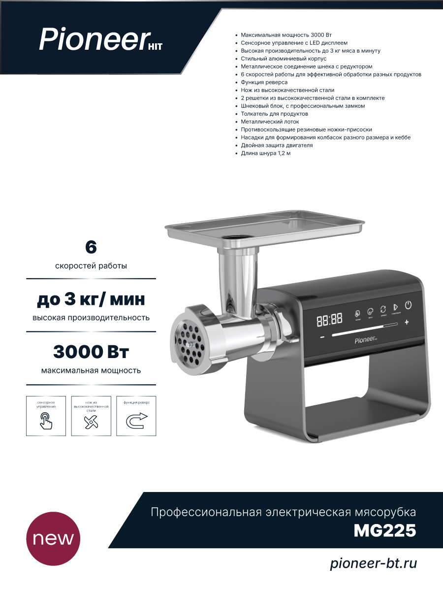 Pioneer MG225 — это сочетание мощности, функциональности и современного дизайна, которое сделает процесс приготовления мяса быстрым и приятным.